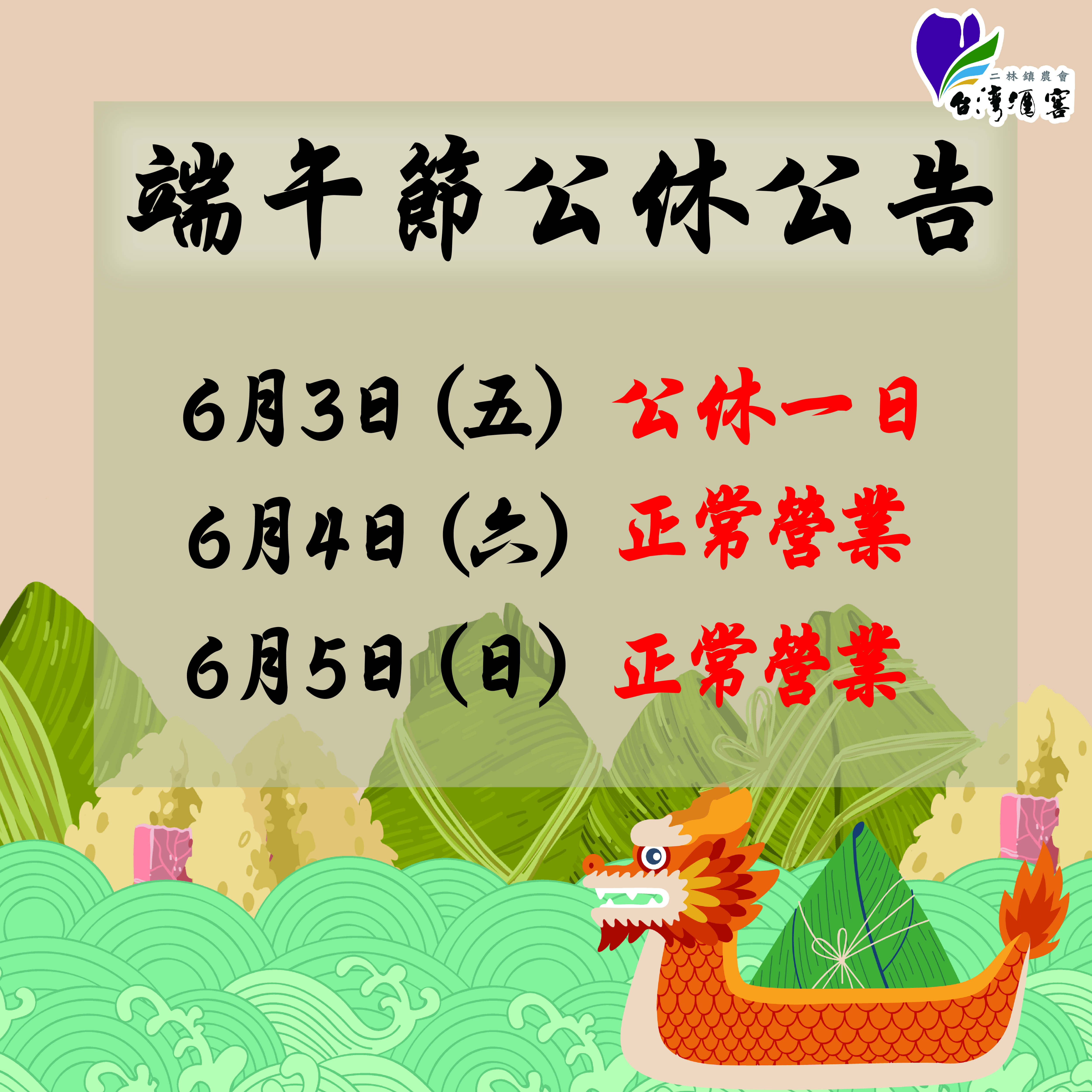 端午節休假公告 2022-05-31 【端午休假公告】 端午節快樂吃肉粽~ 在家吃肉粽之餘也要記得做好防疫工作, 一起將身體養的健健康康~ 6/3(五) 端午節 公休一日 6/4-5(六、日) 正常營業 上一則 回到列表 下一則