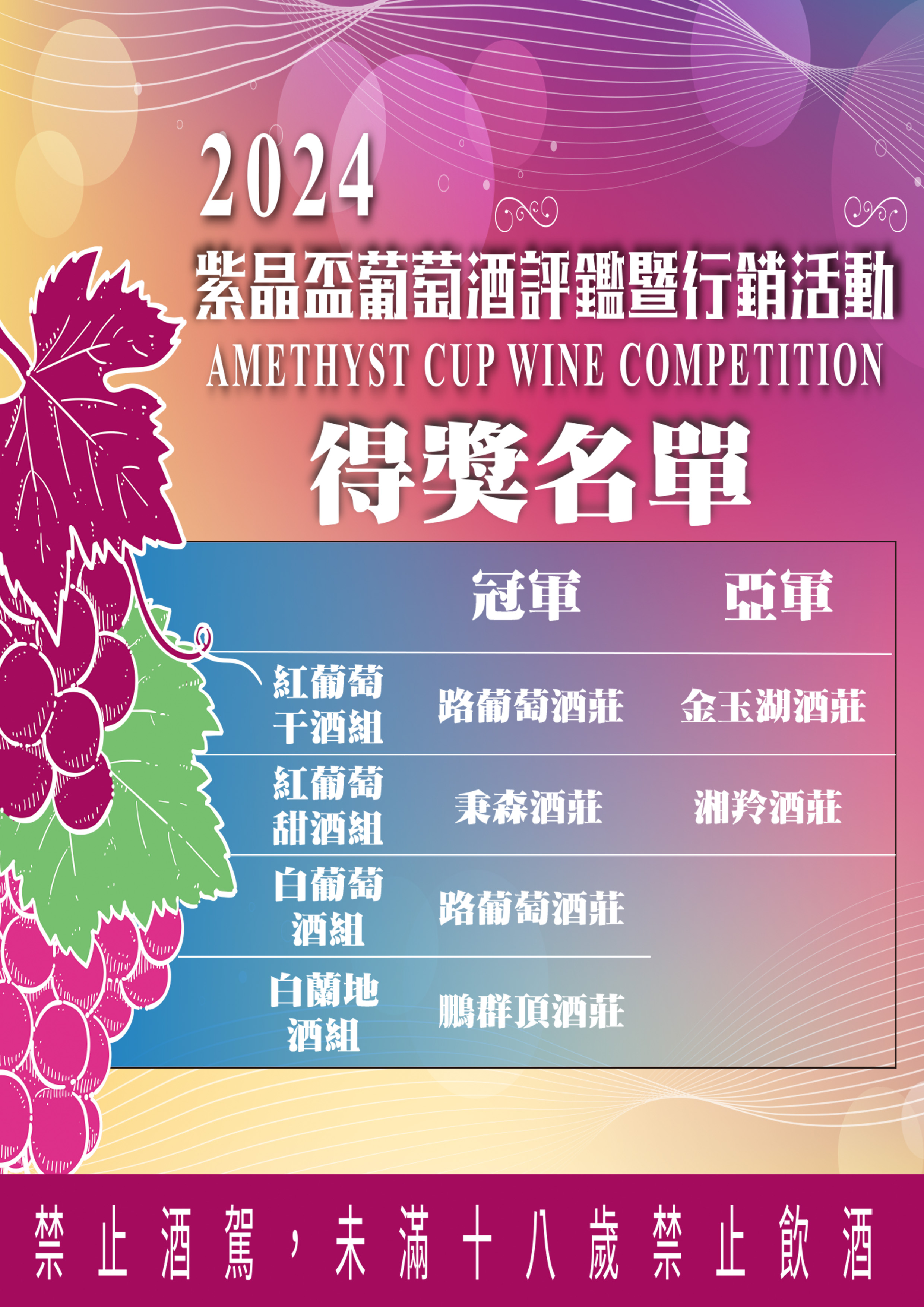 2024紫晶盃葡萄酒評鑑結果出爐!!! 2024-10-15 2024紫晶盃葡萄酒評鑑結果出爐~~ 紫晶盃葡萄酒評鑑已經邁入第19屆囉! 10月06日於二林鎮農會二樓第一會議室辦理2022紫晶盃葡萄酒評鑑, 當天邀請10位國內知名產學界酒品專家參與品評, 將於10月26日於二林文化教育園區辦理新酒發表會,邀請大家共襄盛舉!! 二林鎮農會-台灣酒窖 營業時間:周一~周日 8:00-17:00 電話:04-8903717 地址:彰化縣二林鎮大永里萬原路一段186號(原斗農會旁) 貼心小提醒:未成年請勿飲酒,喝酒不開車安全有保障。 回到列表 下一則