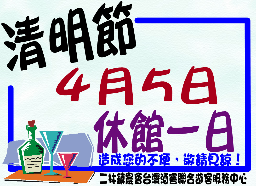4/5清明節休館一日 2019-04-03 4/5清明節休館一日 連假4/4-4/7四天 清明節緬懷祭祖 其他三天則正常營業 別錯過暖和的天氣 在草地上奔跑 順便品嚐二林在地葡萄美酒 選購蕎麥薏仁農特產伴手禮 愉快的連假,快來與美酒邂逅吧 禁止酒駕,未滿18歲者,請勿飲酒! 上一則 回到列表 下一則